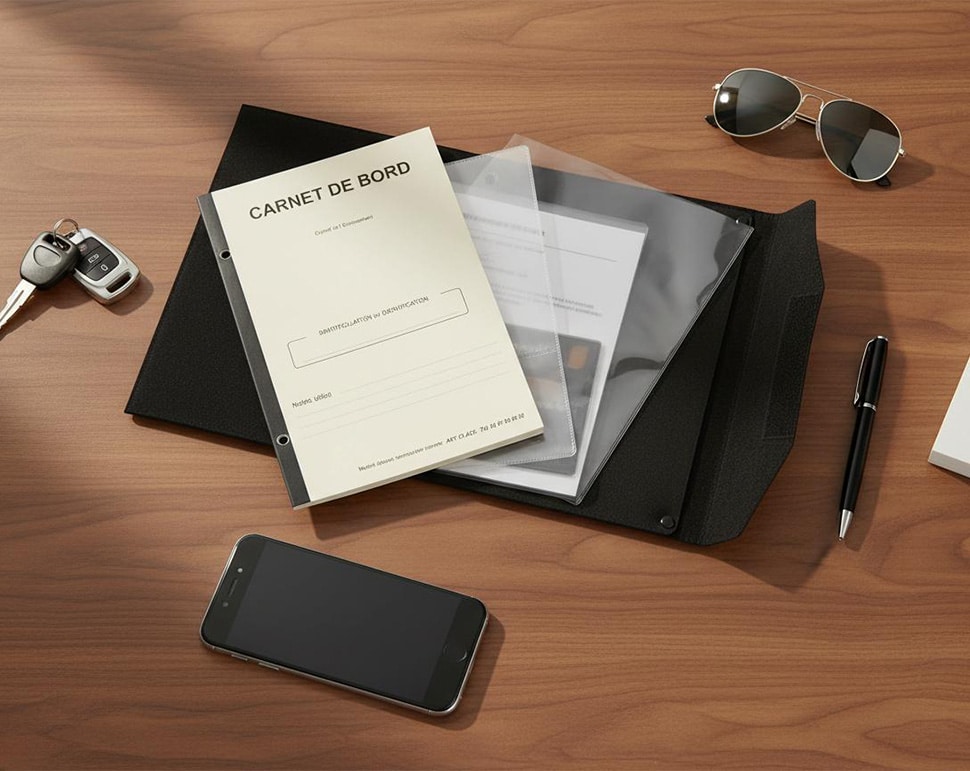 Un étui intérieur en PVC permet le classement de documents complémentaires, comme la carte grise, renforçant l’aspect pratique et fonctionnel du carnet.