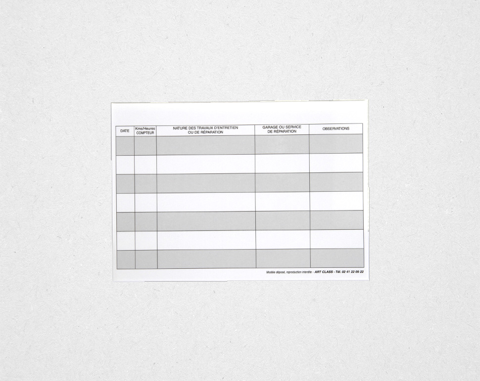 La première de couverture est dédiée à l’identification du véhicule, permettant une gestion claire et individualisée. Les 30 pages intérieures sont spécialement conçues pour l’enregistrement des travaux d’entretien et de réparation, avec des colonnes dédiées à la date, au kilométrage, à la nature des interventions, au garage ou service concerné, ainsi qu’aux observations.