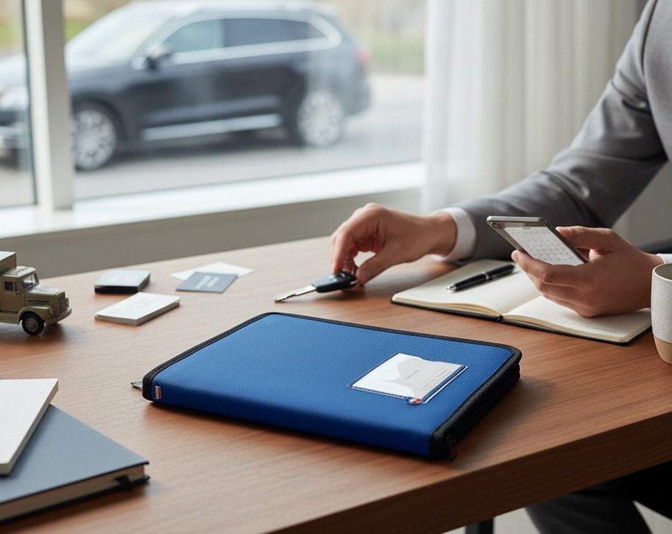 Avec ses dimensions compactes de 195 × 250 mm, il se glisse facilement dans un véhicule, une sacoche ou un espace de rangement dédié tout en offrant suffisamment de place pour les documents indispensables : carte grise, carte carburant, cartes professionnelles, carnets d’entretien, bons de livraison ou fiches d’intervention.